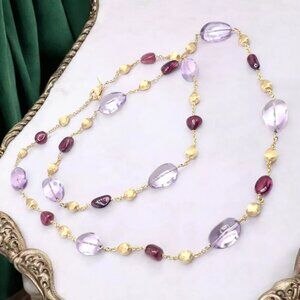 The Marco Bicego necklace is a stunning 31" piece crafted from 18k yellow gold. It features vibrant amethyst and rhodolite garnet gemstones, elegantly interspersed along the chain.