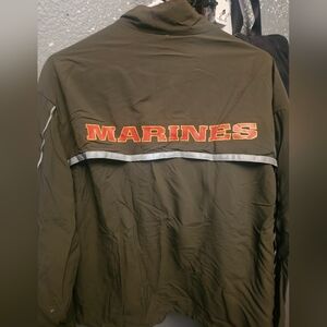 Lightweight olive green full-zip running jacket. Features decal on detail on the chest of marines logo, and marines written on back side. Secure zip pockets and a stand collar offer practical, everyday wear. Easy-care fabric for reliable comfort.