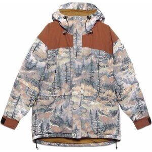 This stylish and cozy unisex puffer jacket is a limited edition piece from the collaboration between The North Face and Gucci. The forest print gives it a unique touch, while the down insulation, water-resistant material, and mid-length make it perfect for cold winter or fall days. The jacket is a size S and features a full zip, hood, collar, and multiple pockets, including inner ones. The outer shell is made of nylon, and the lining is polyamide. The closure in