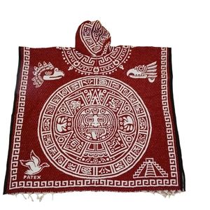 Authentic Mexican Poncho with National Emblem and Aztec Calendar Design | Red