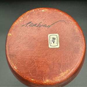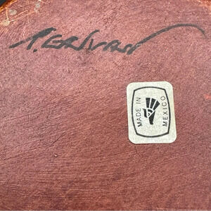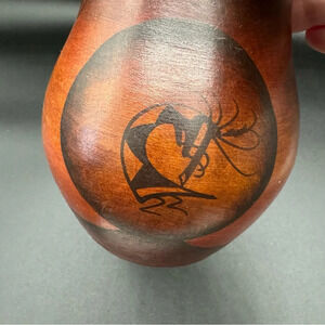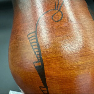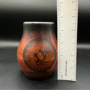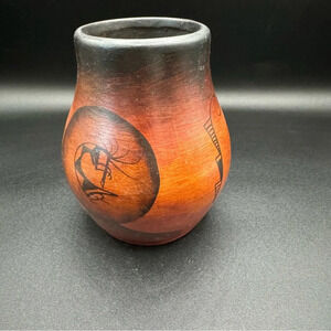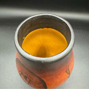 Interesting Southwestern Native American Made In Mexico pottery vase/ container signed R. Galvin who was a Mexican potter. with Kokapeli painted design on the front and a yellowish sandy brown color inside.