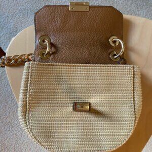 - Woven straw body with pebbled leather trim and flap, gold-tone hardware