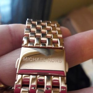 Authentlic Michael Kors Chronograph Watch in gorgeous rose gold with diamond like crystals all around the face. This watch is stunning. Fits about a 7" wrist. Looks brand new, excellent condition. Comes with care pamphlet and box. NEW BATTERY WILL BE INSTALLED AT TIME OF PURCHASE .๐