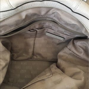 Genuine pearl leather with gold trim details. Can be worn several different way convertible style (see photos) handle slight wear on the handles. Removable shoulder strap