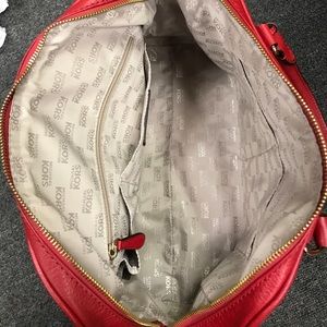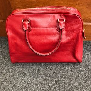 Authentic Michael Kors grommet satchel. Red leather. Gold hardware. Tubular top handles. Hanging capital MK logo. Great condition.