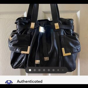 Authentic Michael Kors Beverly soft leather black drawstring satchel with gold tone trim accents metal feet shoulder straps.snap closure center zipper compartment 4 side pockets.pre owned in good used condition no tear normal wear see all pictures any questions please message Z1