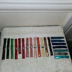 Authentic Michele watch band bundle of 20 of various colors in different leather materials (please see pictures). Most are in good condition, and a few are in used condition. There are also 16 unbranded watch bands of different sizes as well within this bundle of different colors and designs. Many of the bands have velvet band cases that came with the bands. I will consider selling bands separately at $90 each for the Michele bands that are in good condition and used for $40. Please see the measurements of the bands in the pictures.