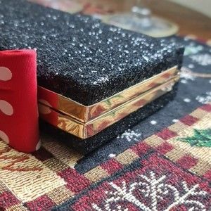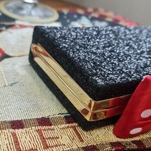 covered with chunky glitter and decorated with an unmistakable minnie mouse bow, this frame clutch (which also features an hidden snake chain) is the perfect way to add a bit of whimsy to your little black dress.