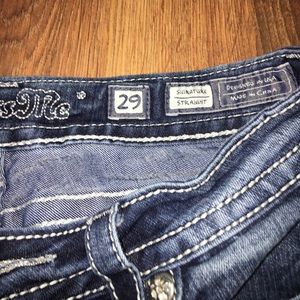 Authentic Miss Me Jeans from Macy's! Super cute! Size 29 Straight. Inseam 33 1/2. Small diamond missing on left side of back pocket but barely noticeable (shown in picture). Smoke free home. I personally have gotten many compliments on these jeans and they hug my curves just right. I recently lost weight though so I am unable to wear anymore. $35 obo
