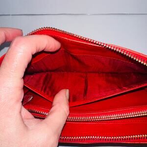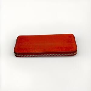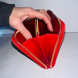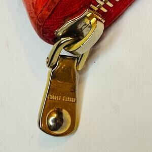 The rich red tone is complemented by the iconic gold Miu Miu logo, while the secure zip-around design opens to a spacious interior perfect for organizing cards, cash, coins, and essentials. Whether used daily or as a standout accessory, this piece adds instant elegance to any collection.