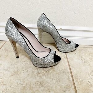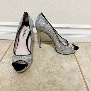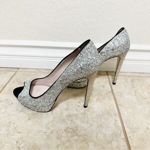 Step into sophistication with these Miu Miu heels, featuring a striking silver glitter finish and contrasting black accents. The peep-toe design and slender high heels add a touch of glamour, making them perfect for any elegant occasion. Experience comfort and style with their classic pump silhouette.