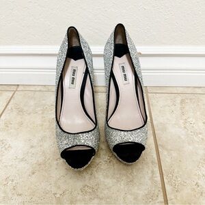 Step into sophistication with these Miu Miu heels, featuring a striking silver glitter finish and contrasting black accents. The peep-toe design and slender high heels add a touch of glamour, making them perfect for any elegant occasion. Experience comfort and style with their classic pump silhouette.