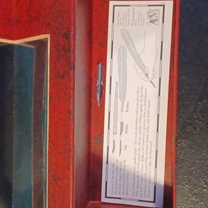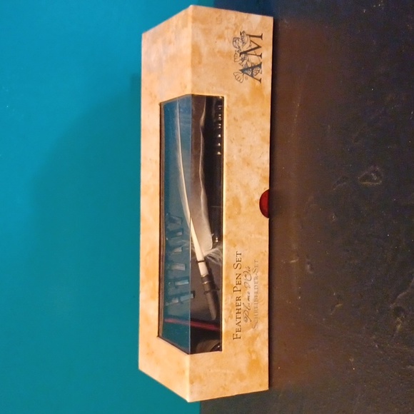 This Authentic Models feather pen set includes one feather pen, one wood stylus pen, 7 nibs, one instructional sheet, and one bottle of ink. Like new.