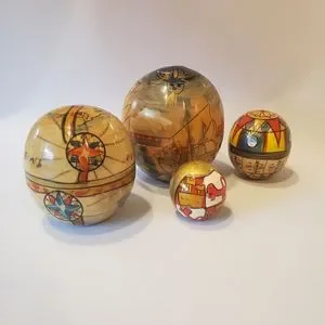 Vintage weather, ships, maps nesting balls. Handpainted, lacquered and initialed by artist inside each piece. 7 pieces total. 4 balls.