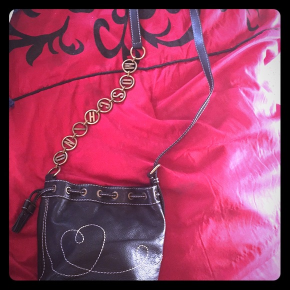 Beautiful Redwall era Moschino with serial code on zipper. Great heart detail design on front, and grommet lace around style on top. Logos encased in circles on portion of strap. Clean interior with moschino logo throughout. Adjustable strap, and beautiful aged brass. Has "tarnishing" but I preference referring to it as aging as it adds character. Gently used. Clean. Crossbody or "normal". Looks amazing with the letters front and center. Extremely rare model!