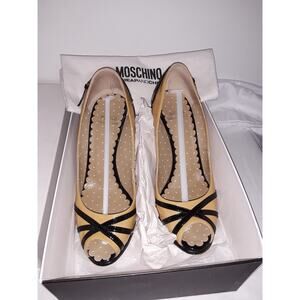 Authentic Moschino Tan & Black Patent Leather Peep Toe Pumps 38 (US 8