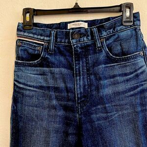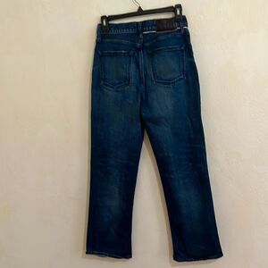 these jeans are a medium wash with high rise cropped and five pockets and a zip and button closure. Japanese denim
