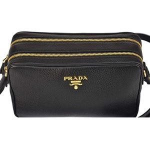New Phenix Double Vitello Zip Black Leather Cross Body Bag features a gold Prada Milano logo on the front and an adjustable leather strap. The two zipper compartments open to a spacious jacquard lined interior that allows for convenient storage and organization. This Prada handbag is great for everyday use with the distinctive quality and style of Prada!