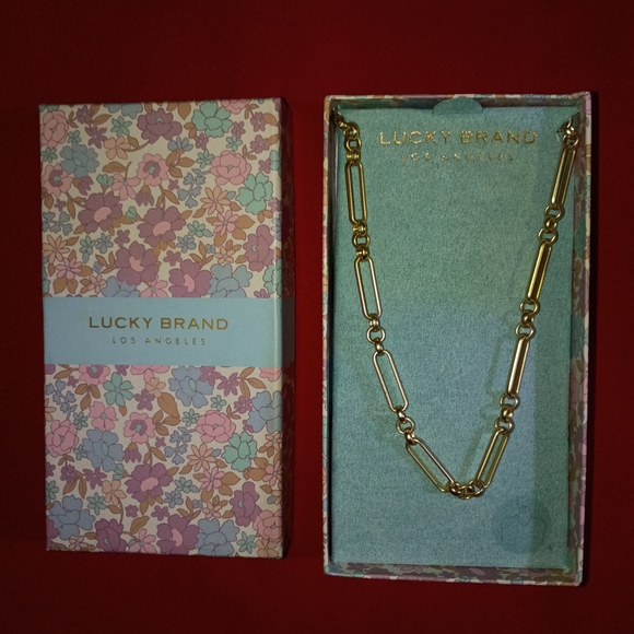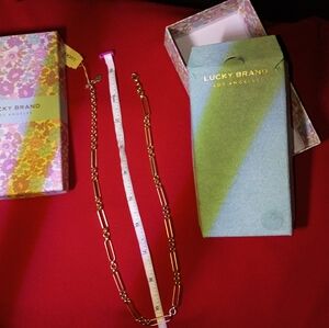 This exquisite gold necklace from Lucky Brand features a unique chain design with alternating tubular and connecting segments, offering a warm, yellow gold finish. Perfect for adding a touch of elegance to any ensemble, this necklace showcases a harmonious blend of style and sophistication.