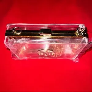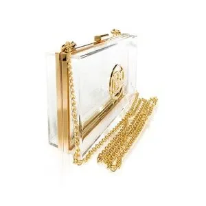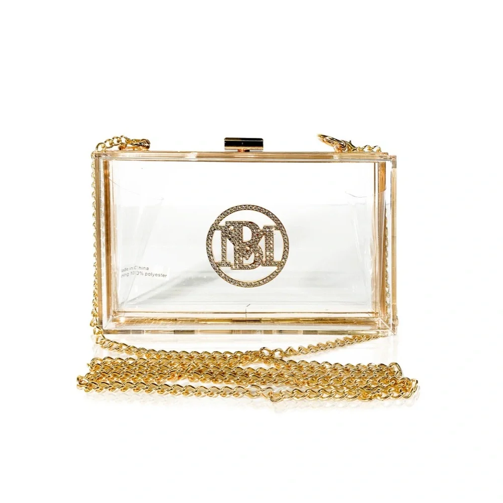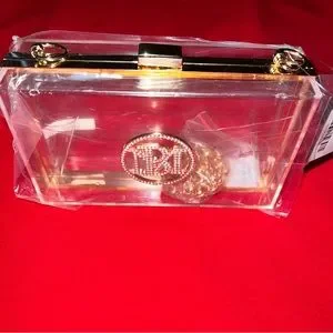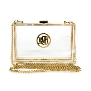 The crystal-adorned logo is the highlight of this piece, stunning against a clear backdrop. The gold chain and detailing ensure this fashion-forward statement look also adds an air of luxury and metallic beauty to your look.