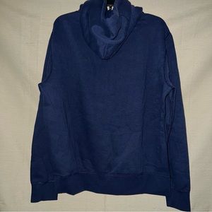 Sweatshirt fleece, embroidered detailing, brand logo, solid color with appliqués, hooded collar, long sleeves, fleece lining, single pocket, large sized..