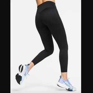 Nike Go - Sustainable Materials Women's Firm-Support High-Waisted 7/8 Leggings with Pockets LOCKED IN SO YOU CAN GO ALL OUT Push yourself forward with the right balance of support and comfort with our Nike Go leggings. Squat-proof—even during your toughest workouts—their sleek, midweight InfinaLock fabric feels compressive and supportive in all the right places. Multiple pockets let you carry everything you could need, whether you're hitting the trail, the gym or the mat. Extra-Wide Waistband Designed to help reduce rolling, pinching and sliding, the waistband helps hold you up and smooths the waist. 6 (Yes, 6) Pockets Keep everything you could need close by with the help of multiple pockets: 2 angled, seamless side pockets for easy access, 3 drop-in pockets at the back waist, and a zip pocket on the thigh. They're ready to hold everything from a key to your phone to lip balm and more. More Benefits Nike Dri-FIT technology moves sweat away from your skin for quicker evaporation, helping you stay dry and comfortable. Internal drawcord lets you adjust the waist when you're on the move. Product Details 7/8 length Body: 68% nylon/32% spandex. Waist Lining: 68% nylon/32% spandex. Gusset Lining: 84% nylon/16% spandex. Machine wash Not intended for use as Personal Protective Equipment (PPE) Color: Black/Black Brand New // Never Worn // New with Tags Included *Please refer to pictures and ask questions