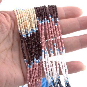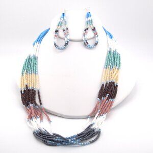 Each piece of strands features genuine glass beads carefully set in intricate color patterns, reflecting the artistry of Native American craftsmanship. These 10 strands of glass beads elegant design drapes gracefully around your neckline, while the matching earrings complete the look with a touch of sophistication.