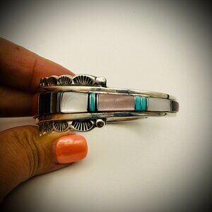 Authentic Navajo Harry Spencer Sterling Silver Multi-Stone Inlay Cuff Bracelet