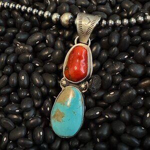 Authentic Navajo Sterling Silver Mediterranean Coral and Turquoise Pendant.