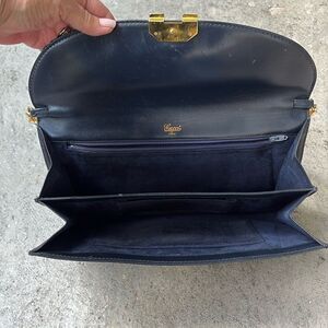Elegant navy leather bag. Features iconic Gucci logo clasp. Sleek shoulder strap design.