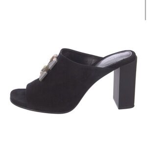 Elegant black mules featuring a striking metallic emblem. Perfect for stylish outings.