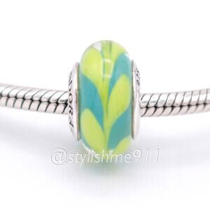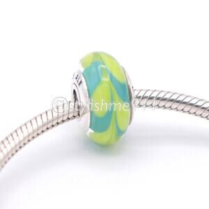This aqua charm with lime green swirl pattern has a sterling silver core. The hand-crafted glass from Murano, Italy looks great with the Lime green Oval Lights charm as well as any sterling charms.
