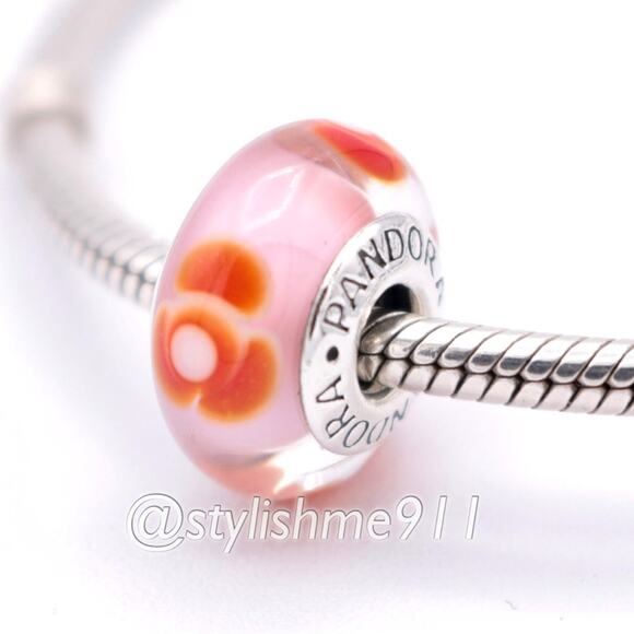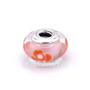 This pink bead with red flower pattern has a sterling silver core. The hand-crafted glass from Murano, Italy looks as great alongside other glass beads as it does gold or silver.