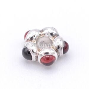 This sterling silver charm has five garnet cabochon gems that will appear to be wrapped around your Pandora bracelet. It pairs well with the Garnet Eye charm as well as the Flowers For You Tangerine murano glass charm.