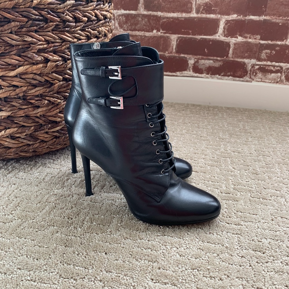 Authentic PRADA Booties. Black leather. Great used condition. One heel though has scratches (it is on the picture). But when you walk it is not visible. Otherwise excellent condition! Made in Italy. Size 37 which is 7 US. Comfortable even though look high. I think it is because they wrap the ankle nicely, and because there are also laces - you can adjust it to your ankle. Will come with 2 silk dust bags and an additional set of Prada tips. No box.
