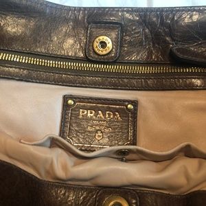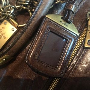 Prada Chain Link Tote Vitello Shine Large, crafted from brown Vitello shine leather, features dual-rolled handles, exterior front and back zip pockets, and aged gold-tone hardware. Its zip closure opens to a pink leather interior with side zip and slip pockets. Factory Code 102.
