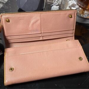 Authentic PRADA Leather Long Wallet in fair preowned condition with signs of wear including peeling, coin pocket lining and fading. Restoration customized edge to match gold metal plate imperfections maybe noted. Zipper and snaps function properly. Space for your cards, bills, coins Cell Phone and accessories .