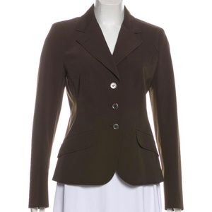 Authentic Prada blazer with notched lapels, structured shoulders, three pockets and button closures at front. The color is brown but more closely represents an olive brown, not chocolate brown. EUC