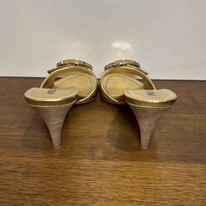 Like New condition PRADA gold leather slide 3" heel with wood buckle. Open back and Open toe design with wood heel. Made in Italy.