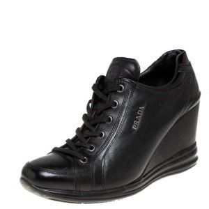 Authentic PRADASport Milano BlackLeather Logo Wedge LaceUp Sneakers EU38.5/US8.5