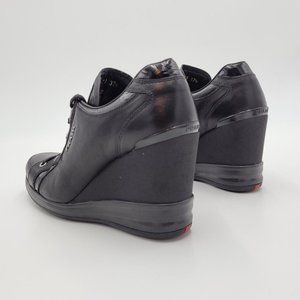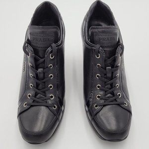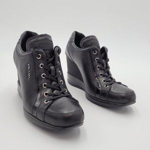 Authentic PRADA Sport Milano Black Leather Logo Wedge LaceUp Sneakers Sz 38.5/ US 8.5,