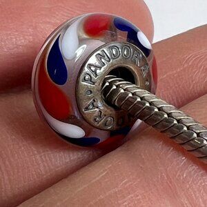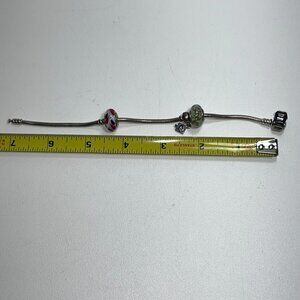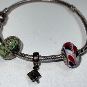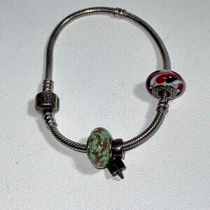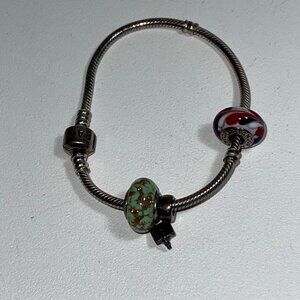Pandora 925 Sterling Silver Charm Bracelet, 2 Charms, inc. Murano Glass Charm.