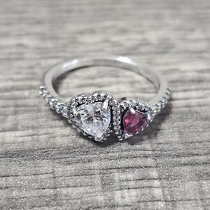 An eye-catching statement of love. This ring showcases two heart-cut stones, one clear cubic zirconia and one vibrant red man-made crystal, connected by a halo of shimmering pavé. Crafted in sterling silver, the top half of the band is adorned with more sparkling stones, creating a radiant effect. Pair it with other sterling silver rings for a love-filled stack, or let it shine as a standalone statement. Inspired by the love that connects us, the two hearts symbolize harmony and unwavering support between two souls.