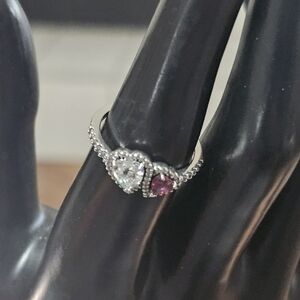 An eye-catching statement of love. This ring showcases two heart-cut stones, one clear cubic zirconia and one vibrant red man-made crystal, connected by a halo of shimmering pavé. Crafted in sterling silver, the top half of the band is adorned with more sparkling stones, creating a radiant effect. Pair it with other sterling silver rings for a love-filled stack, or let it shine as a standalone statement. Inspired by the love that connects us, the two hearts symbolize harmony and unwavering support between two souls.