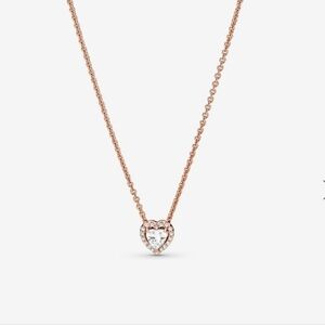 Make a statement with the Sparkling Heart Collier Necklace. Hand-finished in 14k rose gold plating, this necklace is inspired by classic design elements from the Pandora Timeless collection. Featuring a raised heart-shaped central stone surrounded by a halo of clear cubic zirconia, a Pandora crown O monogram logo tag is attached by the clasp. Adjust the necklace length to suit your style and wear with other heart-shaped pieces for a look filled with love.