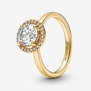 Classic yet modern, the 14k gold-plated Sparkling Round Halo Ring features a round center stone encircled by a halo of brilliant-cut clear cubic zirconia pavé. The Pandora logo is engraved on the inside of the shank. A timeless gift for an elegant Mom.