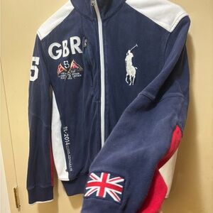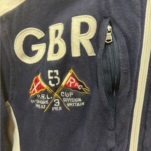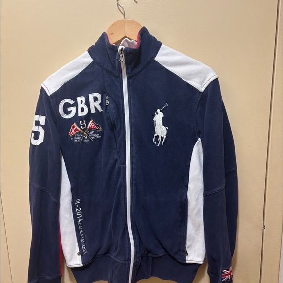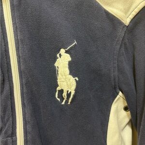 Stylish zip-up sweater with iconic logo. Features navy and white color scheme. Comfortable and versatile.