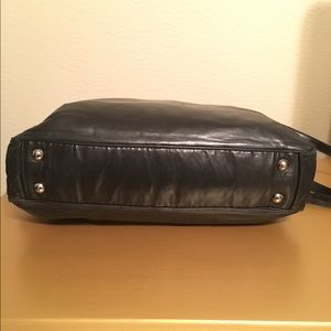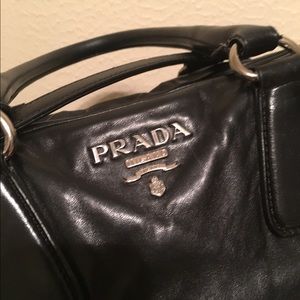 Authentic Fabulous Black Prada Handbag with Silver hardware and detachable and adjustable cross body strap. Short handle strap drop is 7" and long handle strap drop is 18 to 22". Also has lockit feature. Pre loved with minor normal leather aging but exterior still in great shape as seen in photos. Interior in good shape except for a couple of marks at bottom but not too noticeable as shown in photo. Bag comes with all authenticity cards as seen in photos, dust bag, lock, and two keys.