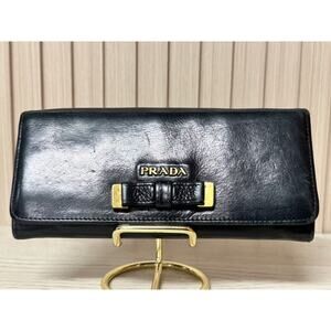Pre-owned authentic Prada Black Leather Long Wallet. The beautiful leather, iconic bow and gold-tone details give this wallet a feminine and elegant look. The overall condition is good. The exterior shows scuffs, and there are rubbed marks on the interior as well. The zipper pull is broken on both the inside pocket and the back exterior pocket.