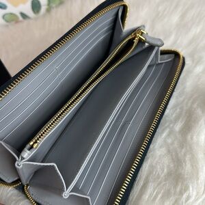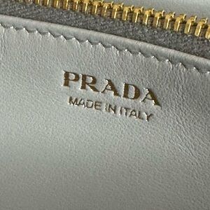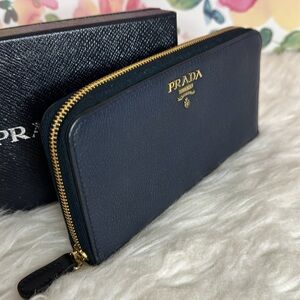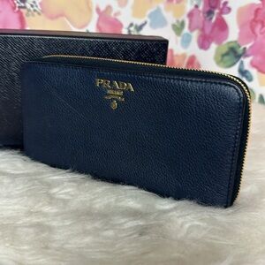 Elegant Prada wallet in black leather. Features gold-tone logo and zipper.